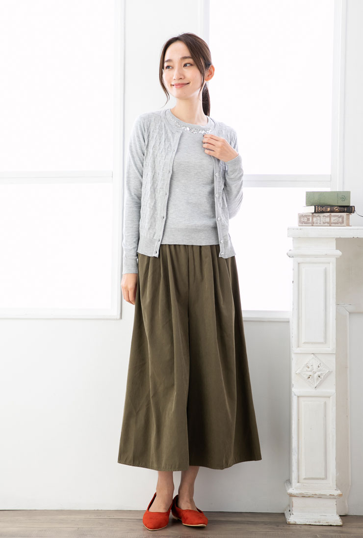 広がり過ぎないスカート見えのシルエット(スカンツ)で、上品に着こなしていただけます。
